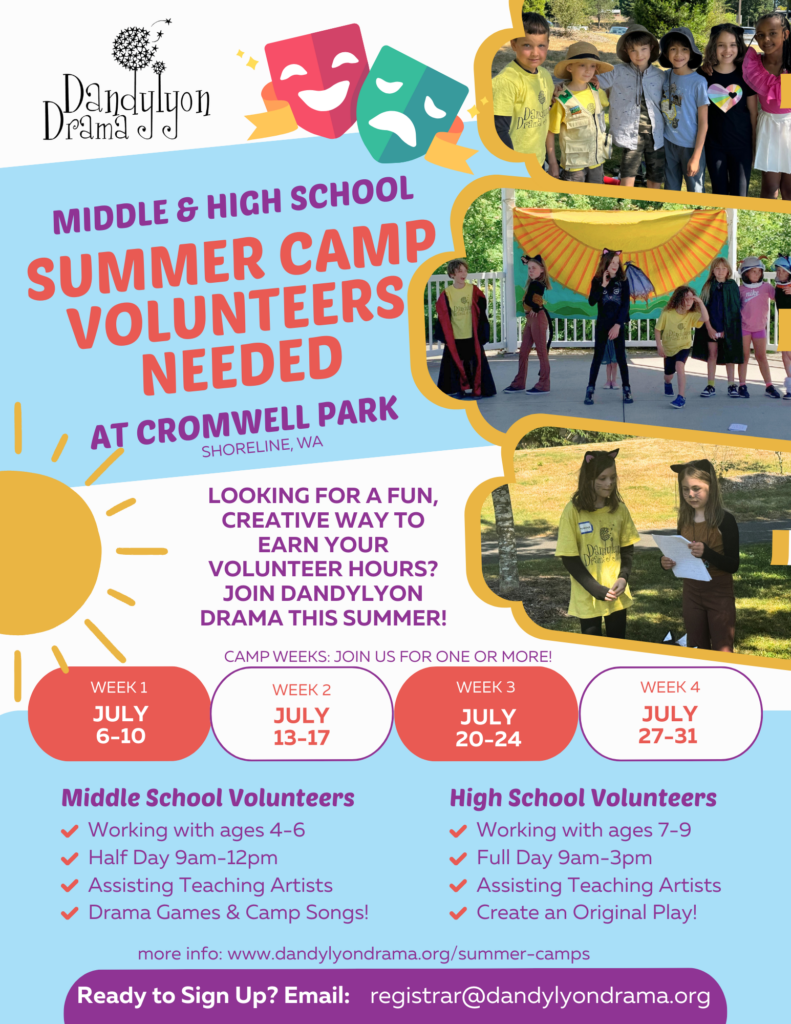 Imagination takes center stage with Dandylyon Drama in this dramatic outdoor camp. Full of creative activities specially designed for 4-6 year olds to explore how to Be Bold! through story, movement, and music. Our Teaching Artists are ready to encourage your camper’s social-emotional growth and confidence through the exciting world of performing arts! Family and friends are invited to join us for a celebratory sharing on the final day of camp.